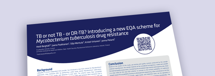 Aurevia, a Finnish independent EQA provider, has introduced a new EQA scheme for Mycobacterium tuberculosis, drug resistance (DR), by performing a pilot study named Mycobacterium tuberculosis, rifampicin and isoniazid, nucleic acid detection in June 2022.