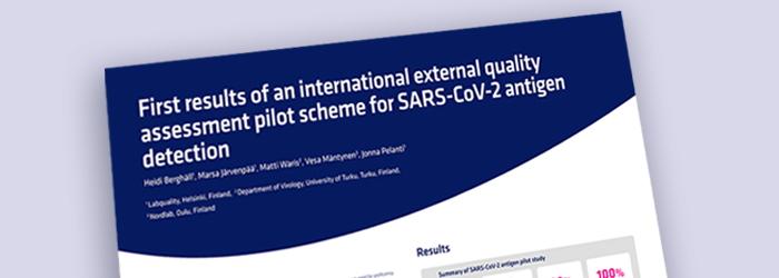 Labquality, a Finnish independent provider of external quality assessment (EQA), responded to the urgent need for proficiency testing (PT) for methods detecting SARS-CoV-2 by arranging international EQA pilot studies for nucleic acid detection, antibody detection and most recently for antigen detection. The response from participants was very positive and we organized altogether eight SARS-CoV-2 EQA rounds during 2020 including more than 850 participants.