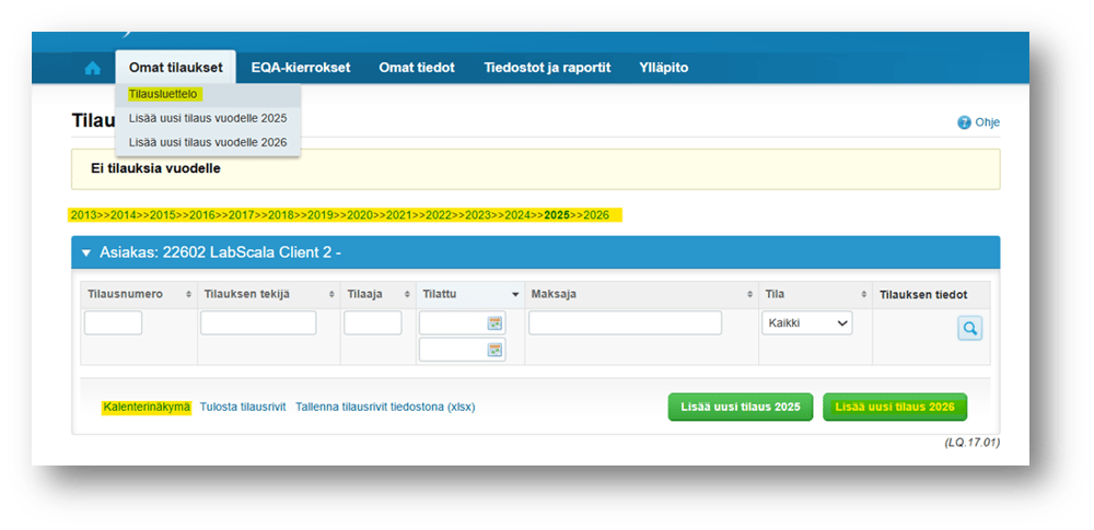 Tilausnäkymissä voitte vaihtaa eri vuosien välillä, tekemällä valinnan vuosilukujanalta, näkymän yläreunasta. Lista tehdyistä tilauksista löytyy linkkipalkin valikosta Omat tilaukseni → Tilausluettelo.