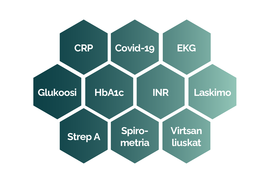 Valittavana on 10 eri kurssia: Covid-19, CRP, EKG, Glukoosi, HbA1c, INR, laskimonäytteenotto, spirometria, Strep A ja virtsan liuskatutkimukset. Kaikki kurssit sisältävät laadukkaan ja interaktiivisen täydennyskoulutusosuuden, sekä lyhyen tentin.