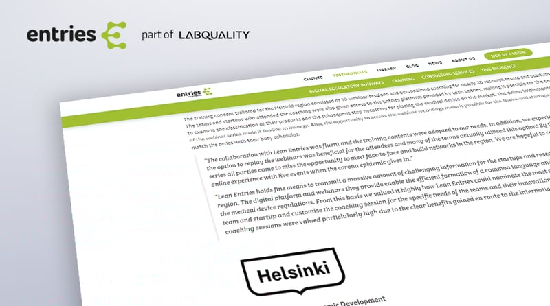 Helsingin kaupunki ja Labqualityyn kuuluva Lean Entries toteuttivat yhteistyössä Regulatory Essentials in Health Tech -koulutuksen keväällä 2021. Kohderyhmänä oli Helsingin alueen terveysalueen tutkijatiimit ja startupit, ja koulutus oli osa Helsingin kaupungin kasvuyritys- ja innovaatioekosysteemin kehittämistä.
